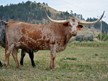 Beautiful grulla and white Saddlehorn son with the leaned back horn set.